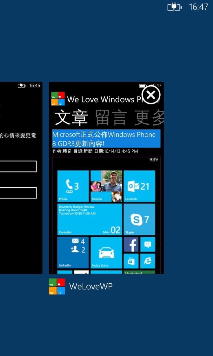 不過,在GDR3 只需在多工頁面中,按下該程式畫面右上角的「X」便可關閉該程式,十分方便, 也令我想起了 Symbian Belle (小編非常喜歡Symbian)。可是,小編認為,如果不小心錯按了「X」,運作中的App 便被關閉,有機會失去未儲存資料! 因此,大家要多加留意。