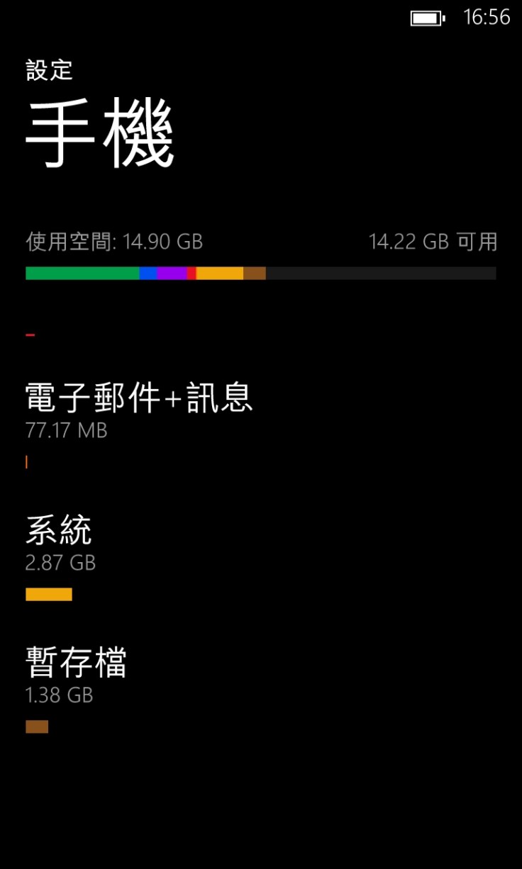 在GDR3之前,WP 內置的「手機儲存系統」的功能相當不足,而Nokia Lumia 用戶可以使用其專用的「儲存空間檢查」來檢視儲存空間的分布情況,但對其他廠商的WP 用戶來說有點無奈。不過,在GDR3 中,WP 內置的「手機儲存系統」的功能終於進一步提升,大家可以查看儲存空間的佔用詳細情況。可是,這功能尚未如Nokia 的「儲存空間檢查」般能夠列出每個程式及遊戲實際所佔用的空間,希望未來會加入吧!