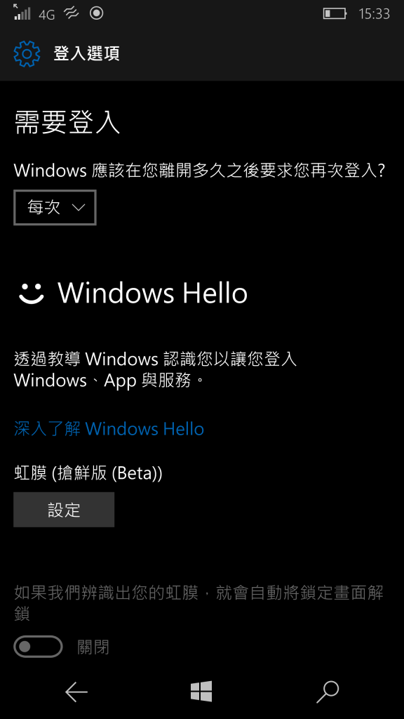 當時使用虹膜解鎖時,Lumia 950 右上角會亮起一顆紅燈,傳說中要望著前置鏡頭,並非紅燈。Man 使用了一段時間,發現解鎖速度不算太快 (尤其是光線不足的時候),而且不時辨認失敗,最後還是要使用密碼解鎖,更加麻煩。Man 發現除下眼鏡後,辨認速度及準確度有所提升,但小編不可能每次解鎖都要除下眼鏡吧。不過,對於 Lumia 950 的 Windows Hello 屬於測試階段,所以還有進步空間,微軟願意踏出與眾不同的第一步,值得一讚。同時,Man 覺得使用虹膜解鎖較耗電,關掉後發現有改善。
