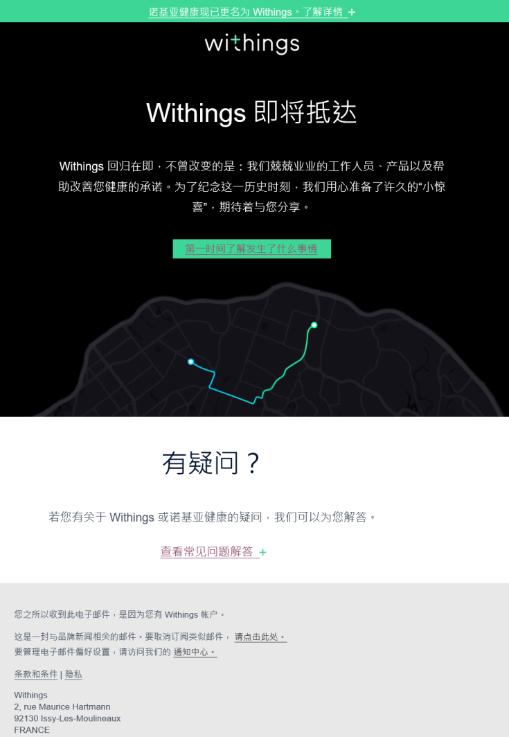 Nokia 早前宣布把 Nokia Health (即原 Withings) 業務出售予 Withings 聯合創辦人 Eric Carreel,由他重新接手,重建 Withings 公司。今日,Nokia Health 及 Withings 向現有客戶發出電郵,宣布 Withings 即將回歸市場,而 Nokia Health 已更名為 Withings。Withings 的網站 (withings.com) 將重新啟用,現設倒數計時,將於香港時間9月18日下午三時啟用。同時,從電郵的辦公地址可見,新 Withings 的辦公室設於法國,更設有全新 logo (見第一張圖片)。