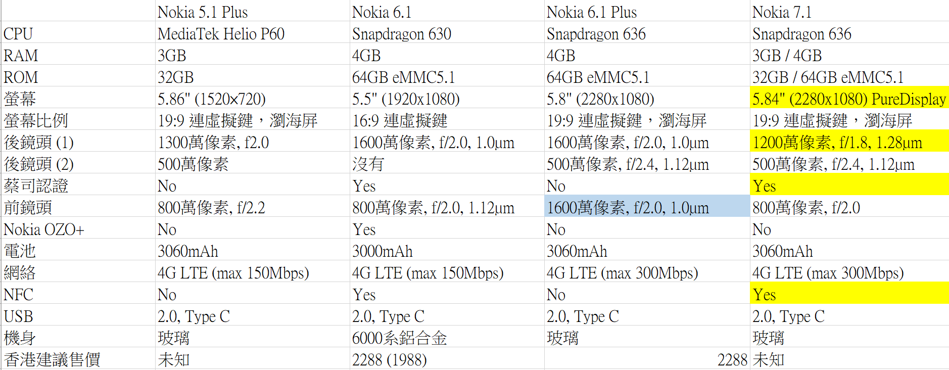 是次比較表順便加入 Nokia 5.1 Plus (Nokia X5) 及 Nokia 6.1 (Nokia 6 (2018)),一同比較,方便大家作出選擇,但以下的分析主要圍繞 Nokia 6.1 Plus 及 Nokia 7.1 討論,畢竟 Nokia 5.1 Plus 的售價、定位與 Nokia 7.1 相差太遠。