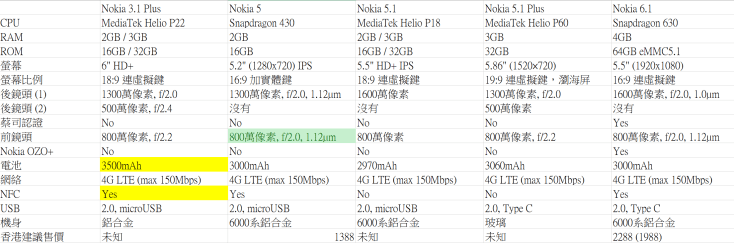 Nokia 3.1 Plus 售價親民,屬低階機行列,但規格比 Nokia 3、Nokia 3.1 優勝不少,故與 Nokia 5、Nokia 5.1、Nokia 5.1 Plus 比較,而 Nokia 6.1 現屬2000元有找的手機,所以一同比拼,供大家參考,而文末有 Man 的評論。