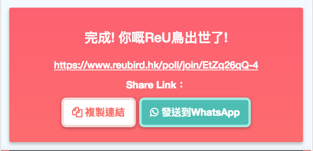 其實之前都見過有其他公司整類似嘅工具,但就唔太貼地,一係就要download個app,一係就複雜到好似google form咁,所以冇乜friend用。反而ReU鳥都算係個驚喜,首先佢係web-based,搞手同Friend都唔洗download任何嘢,同埋幾中意佢同Whatsapp個結合,一整完個投票就可以即刻Send去Whatsapp group/或者Whatsapp比幾個指定嘅friend,大家投完票又可以一噤就send返個最新結果去Whatsapp道,的確慳番大家唔少功夫,佢哋網址好易記,一上 www.reubird.hk 就會見到依個夾時間工具,絕對推介各位搞手試用!