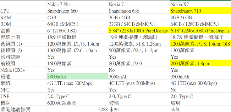 7. 黃色 highlight 為 Nokia X7 優勝之處,綠色 highlight 則為 Nokia 7 Plus 優勝的地方