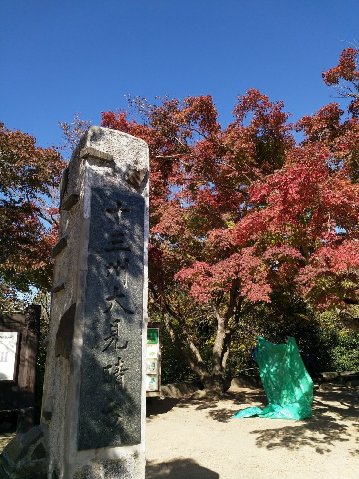 準備歸去之時,發現十三州大見晴台這個地標,驚覺背後有一棵變色變了七成有多的楓樹。在十一月初,山上的楓樹只變了少許色,不少更是毫無變色,唯獨這棵「見晴台」旁邊的楓樹變色變得最快、最多,故留下拍照、欣賞。難道晴天易變,感染旁邊的楓樹? 看來這「晴楓」不太正常,只好稱其「晴瘋」好了。發現自己曉暢賞楓之理時,發現時間不早,不宜留戀此樹。下山前買了個高尾山名物天狗燒,黑豆味道不錯,值得推介。