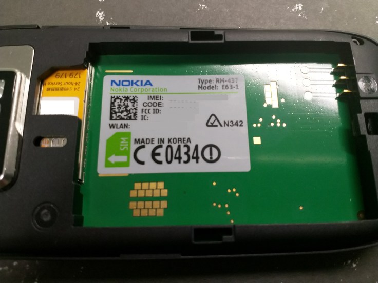 Nokia E63 是在韓國製造,使用 Mini SIM (傳統大 SIM 卡)。一些敏感資訊被塗走