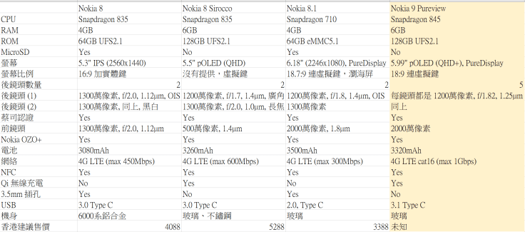 1. Nokia 9 Pureview 還未在香港、台灣上市,故沒有提供售價