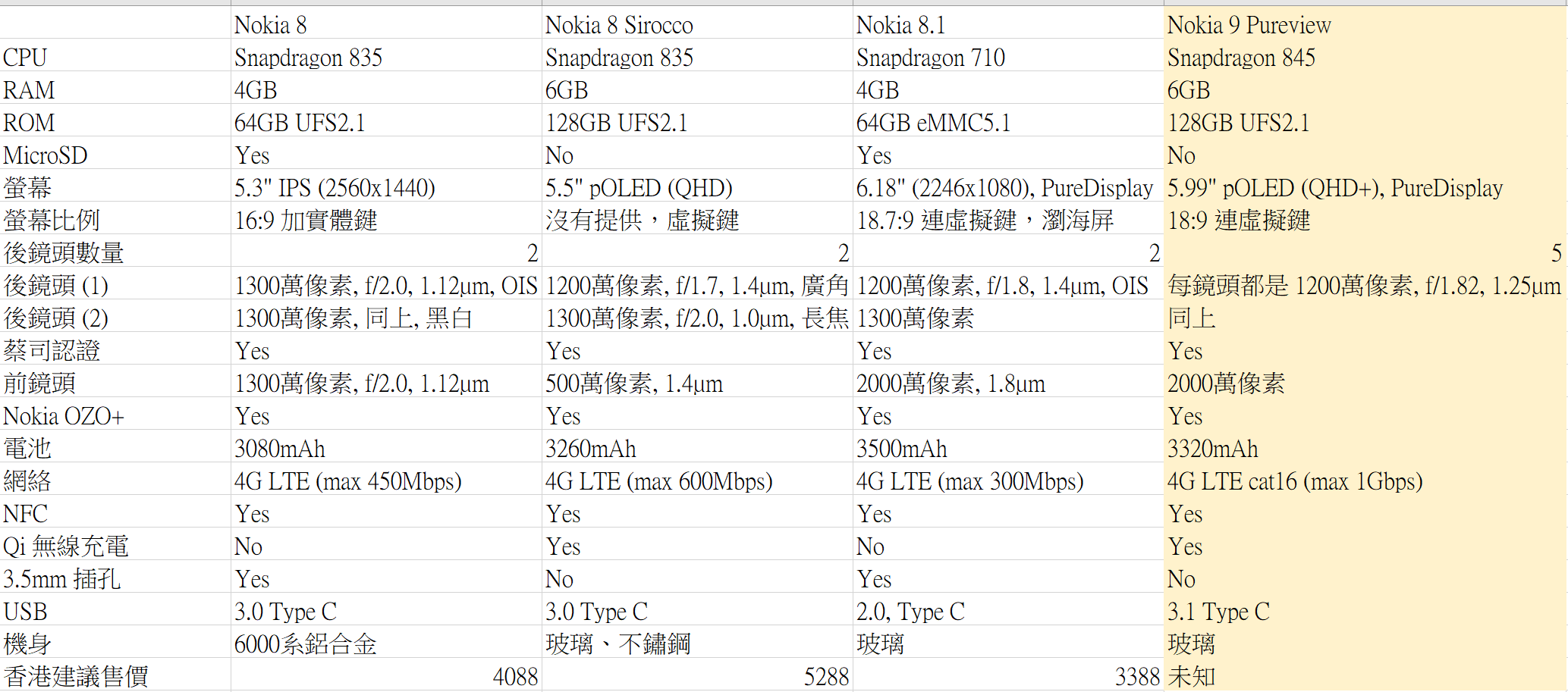進行比較之前,大家必須留意 Nokia 9 Pureview 是最新的旗艦,Nokia 8 Sirocco、Nokia 8 都是舊款旗艦,而 Nokia 8.1 就是中高階型號。Nokia 8 Sirocco、Nokia 8 已經在大部分商店下架,所以兩者的規格單純讓大家作參考。現時市場只有 Nokia 9 Pureview、Nokia 8.1,預計兩者價格相差甚遠,應該有兩千港元之差。
