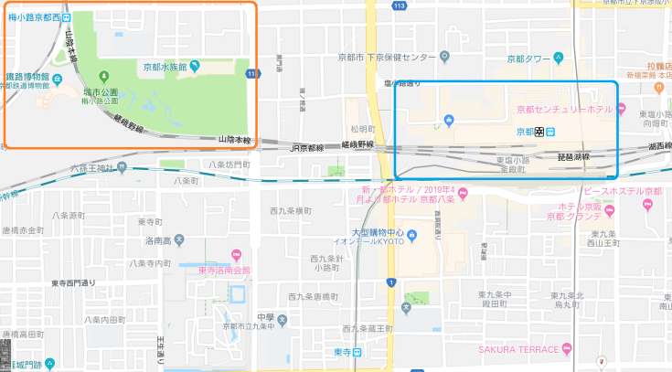 藍色圈為本文預設的出發地,京都站。橙色圈為本文的目的地,梅小路京都西站,以及附近的景點