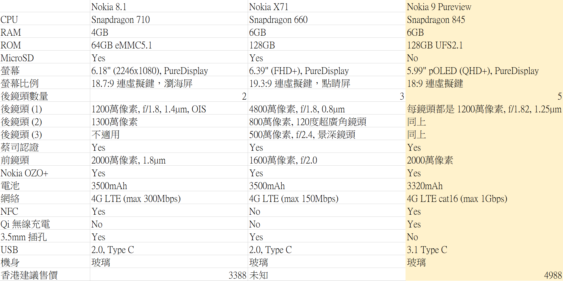 由於小編病了一個月,一直未能完全康復,導致近來精神欠佳,容 Man 不寫介紹文,改為直接推出規格比較文,好留些精神寫 Nokia 9 Pureview 的開箱文。一如以往,Man 希望透過規格比較圖,讓大家比較 Nokia X71 與 Nokia 9、Nokia 8.1 的分別,了解各自的優點與缺點。如果大家想比較 Nokia 8、Nokia 8 Sirocco 這些舊型號的話,可以閱讀<<密集恐懼症之 Nokia 9 Pureview,一張圖助你選擇>>。