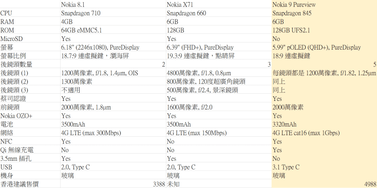 七八與八七之 Nokia 8.1、Nokia 8、Nokia 7.1、Nokia 7 Plus,一張圖助你選擇