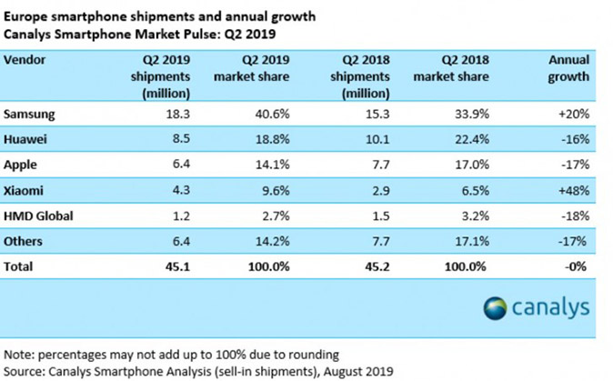 第四名的小米的出貨量則由二百九十萬急增至四百三十萬,拉闊與 HMD 的差距至三百一十萬部。Apple 與 Huawei 之出貨量各下跌過百萬部,然而 Samsung 的出貨量增加三百萬部,市佔率升至40.6%,鞏固第一名的地位。