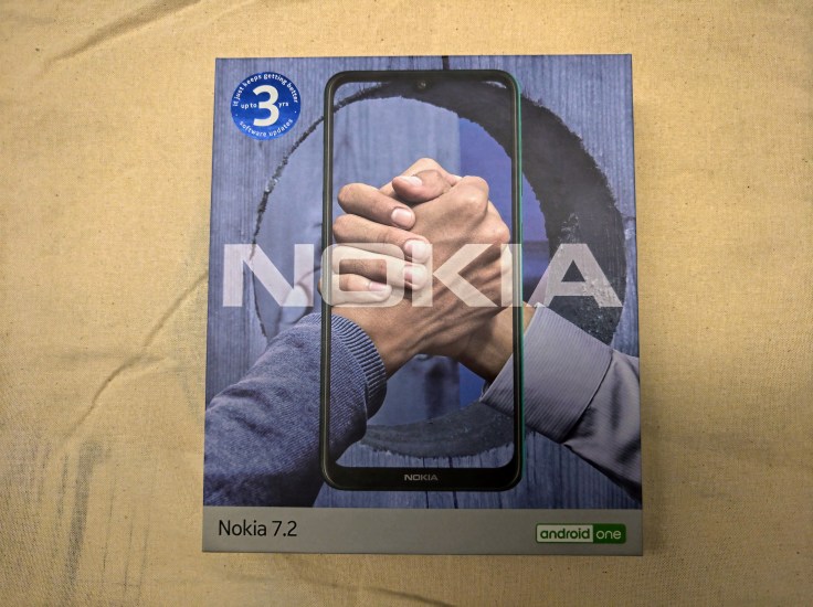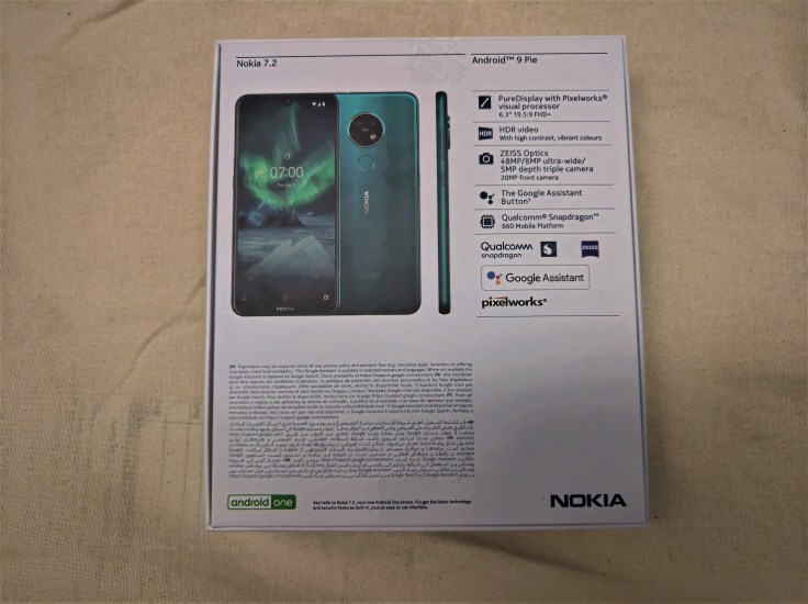 包裝盒清楚列明 Nokia 7.2 屬 Android One 成員的特點,左上角的貼紙就標榜電話可獲得三年的軟件更新