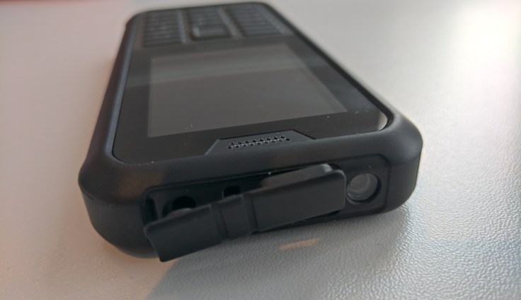 塑膠機背採用重度磨砂設計,增強表面的摩擦力,絕不滑手。另外,一體型機身的電池不可自行更換,而 2100mAh 電量比一般功能手機多一倍 (例如 BL-5C 僅有1020mAh)