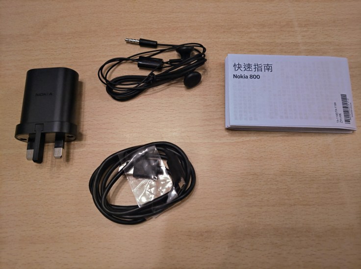配件一覽,充電器為 5V1A,輸出比一般傳統手機多,使用 MicroUSB 插孔