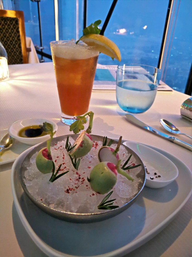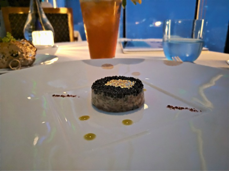 酒店內有多家餐廳,最具特色的有兩家: Al Muntaha 與 Al Mihara。前者位於酒店頂層 (27樓),可飽覽杜拜海岸線之景色;後者設全景水族館,猶如置身海底進餐。Man 當晚選擇 Al Muntaha,食正宗法國菜,總廚為米芝蓮三星名廚 Francky Semblat。一個 5-course 晚餐索價 650AED,配酒就貴很多。有興趣的讀者可瀏覽其官網:
