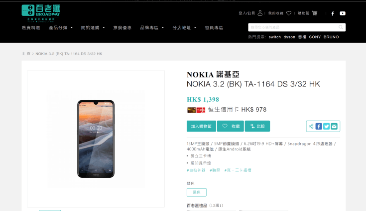 百老匯與恆生銀行推出信用卡優惠,恆生信用卡持有人可用港幣978優惠價購買 Nokia 3.2,比原價港幣1398節省四百多元,成為市面上少有售價低於1000元的原生 Android 選擇,為預算有限的讀者帶來難得的機會。