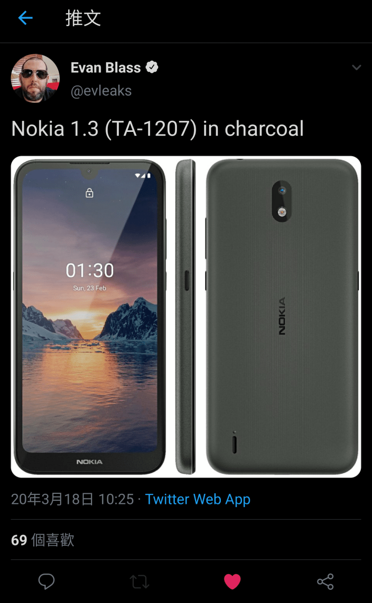 鼎鼎大名的爆料大神 evleaks (Evan Blass) 對 Nokia 總是特別關心,在發布會前放出聲稱是 Nokia 1.3 (TA-1207) 的圖片。圖中的 Nokia 1.3 為灰色款式,可見有水滴屏、Google Assistant 按鍵,其他設計就與之前的 Nokia 2.2 接近,塑膠機背就加上直線坑紋,紋理設計與 Nokia 2.3 相近,符合早前傳聞。