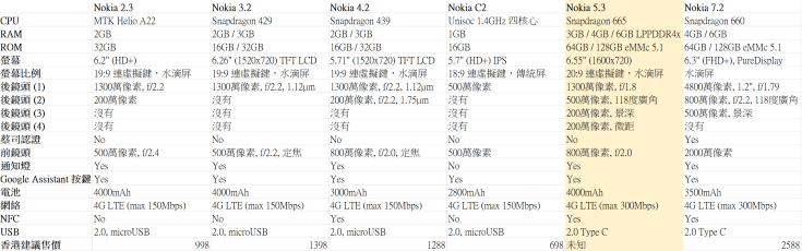- 更正: Nokia 7.2 的建議售價為港幣2598,部分店鋪優惠價為港幣2288