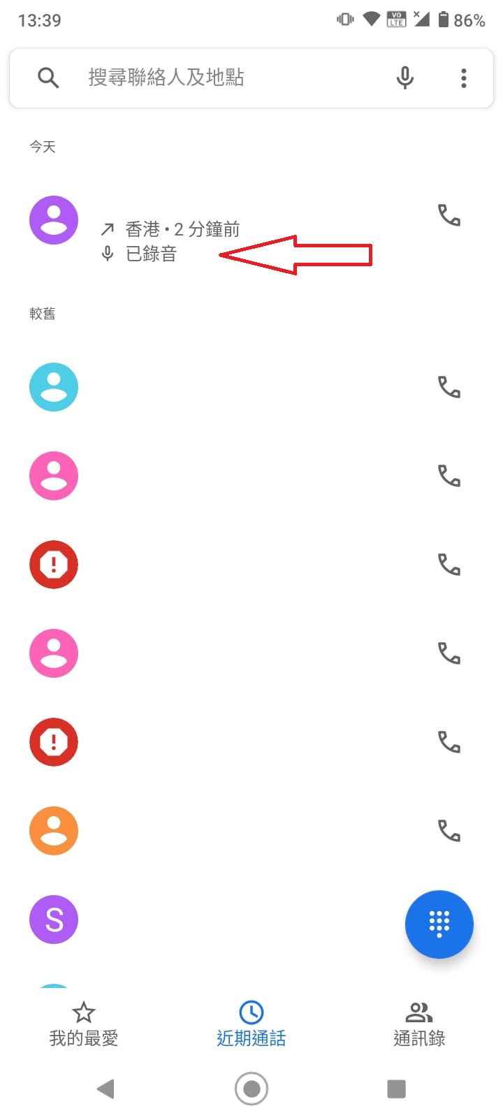 通話完成後,大家可在通話紀錄中找回錄音 (系統會標示為已錄音),點擊該通話紀錄以存取錄音
