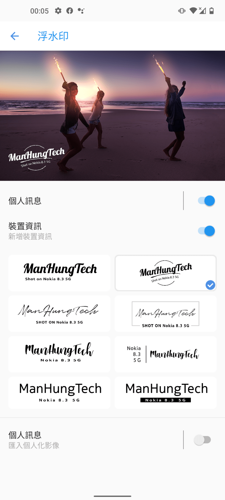 除此之外,Nokia 8.3 5G 可讓用家自行設計相片的浮水印,放在相片左下角。水印分為兩部分,有個人訊息 (例如 ManHungTech) 及裝置資訊 (Shot on Nokia 8.3 5G),一共有八款水印造型可供選擇。Man 希望 HMD 可加入舊有 ZEISS 的字體,以標榜其蔡司認證鏡頭。
