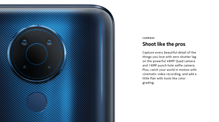 雖然 Nokia 5.4 只算千元價位的低階產品,但 HMD 銳意提升其攝影、攝錄實力,同時注入原屬 Nokia 8.3 5G 的專業技術,讓預算有限的買家都可以享受到 Nokia Mobile 最新技術。Nokia 5.4 採用四鏡頭配置,主鏡頭升級至4800萬像素鏡頭,與 Nokia 7.2 看齊,其餘鏡頭為500萬像素廣角鏡頭、200萬像素景深鏡頭、200萬像素微距鏡頭,跟 Nokia 5.3 相同,可見 HMD 集中改善 Nokia 5.4 的主鏡頭,有助發揮一系列新設專業攝錄功能。前置鏡頭為1600萬像素,可以拍攝迷人的自拍,留下醉人倩影。
