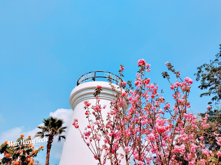 Man 最喜歡此圖,燈塔帶有西洋海岸風情,冷色濾鏡讓櫻花、藍天白雲變得更好看