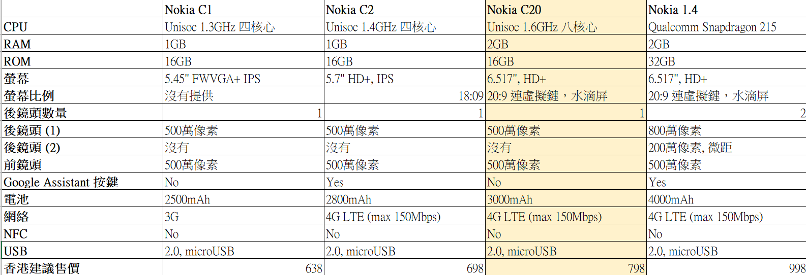 - 目前未知 Nokia C1、Nokia C2、Nokia C20、Nokia 1.4 於台灣的上市詳情及售價