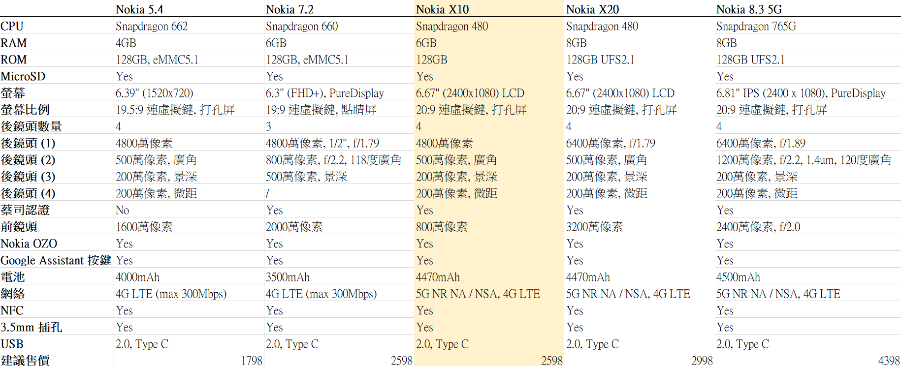 - 目前未知 Nokia X10、Nokia X20 台灣版本 RAM、ROM 配置