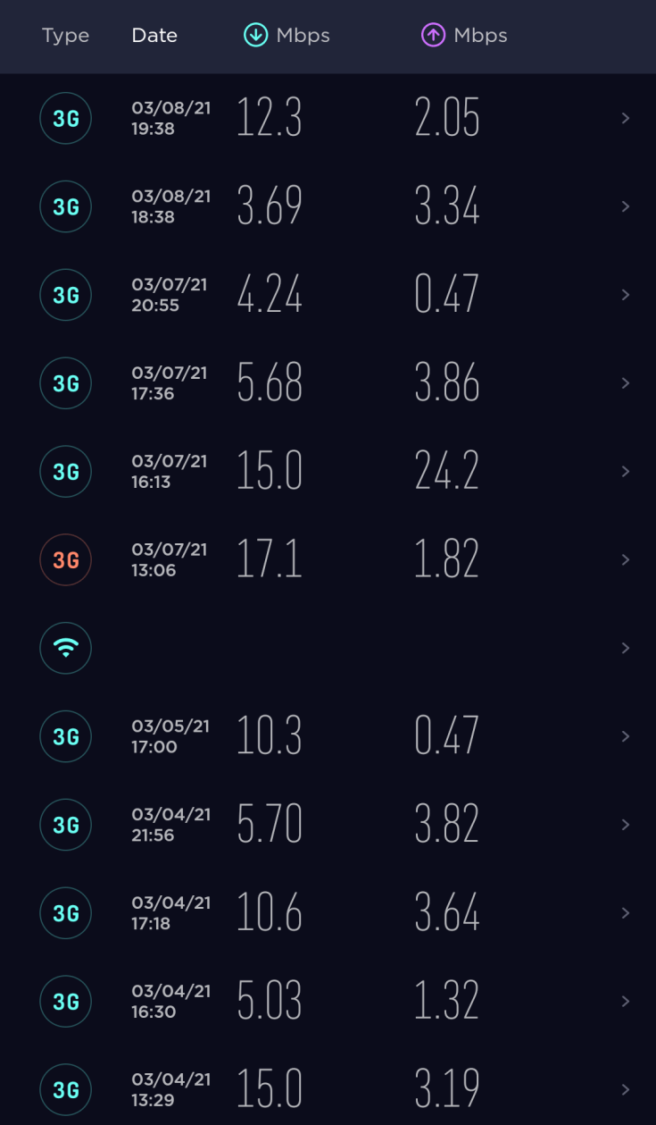 從以上測速結果可見,3HK 的 3G 網絡下載速度並非太低,即使頻譜有限,最低都有 2Mbps 以上,有時甚至超過 10Mbps,就算未如 4G 網絡之速度,亦足以應付日常需要,例如通訊軟件、社交媒體、網頁瀏覽。反而上載速度較差,不時出現下載速度高、上載速度極低的情況,上載速度低過 1Mbps 並非閒事,這也是 3G 年代的特色。