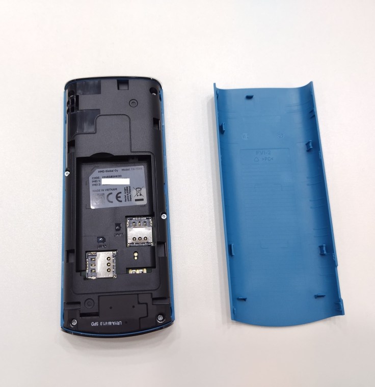 打開外殼,雙 SIM 卡均使用 Nano SIM。這部手機是越南製造,據悉現時大部分 Nokia 功能手機都是越南製造。雙 SIM 卡槽金屬開關未算容易使用,講求技巧與力氣,希望 HMD 多加留意