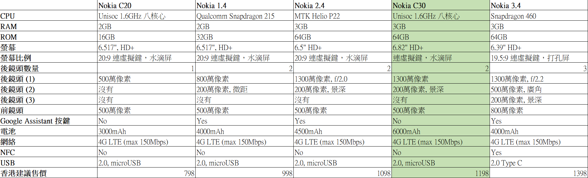 - 目前未知 Nokia C1、Nokia C2、Nokia C20、Nokia 1.4、Nokia C30 台灣上市詳情及售價