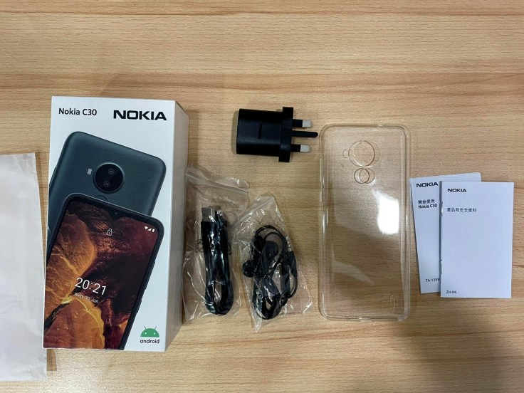 Nokia C30 隨機附送 5V2A 充電器、microUSB 線、耳筒、透明膠套,非常齊全