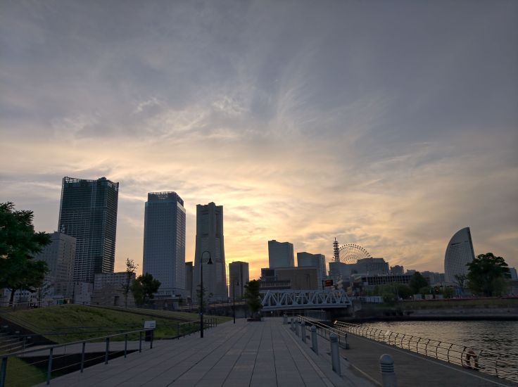 海港寧靜舒適,紅磚倉庫氣勢宏偉,與天際晚霞營造獨特意境。眺望不遠處的遊輪碼頭,去年鼎鼎大名的鑽石公主號亦停泊該地。晚飯後向馬車道站出發,準備回程返東京,沿途細看橫濱港景色,並以手機紀錄眼前風景。