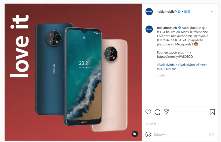 Nokia G50 的規格流傳了一段時間,今日法國 Nokia Mobile 於官方 Instagram 帳戶上載 Nokia G50 官方宣傳圖,並公布部分規格及特色。事出突然,由於 Nokia Mobile 官方網站仍未顯示 Nokia G50 的資料,相信該貼文為意外流出,純屬大意疏忽。按照 Man 所打聽的消息,Nokia G50 最快會在九月發布。