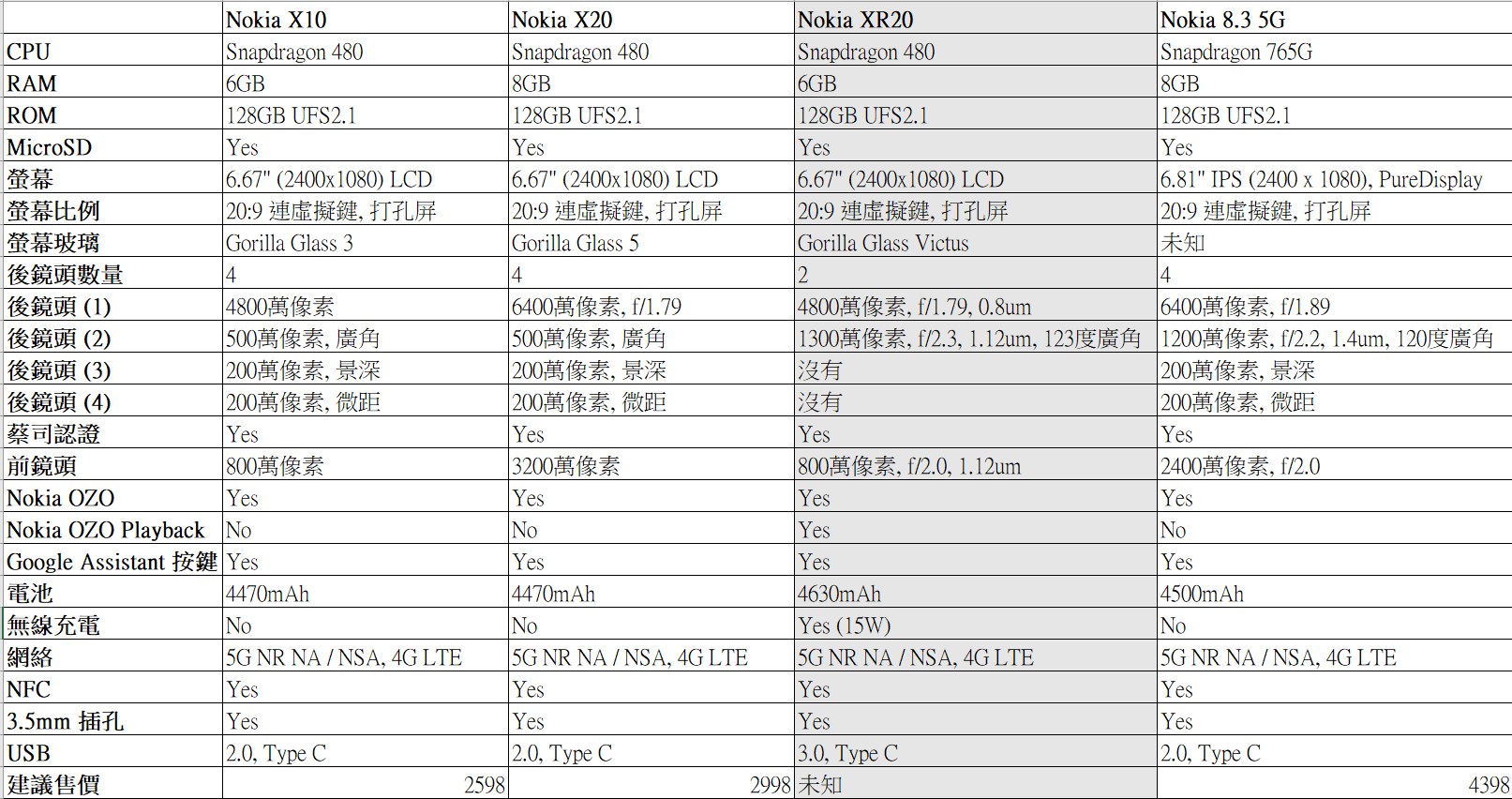 - 目前未知 Nokia X10、Nokia X20、Nokia XR20 台灣版本 RAM、ROM 配置