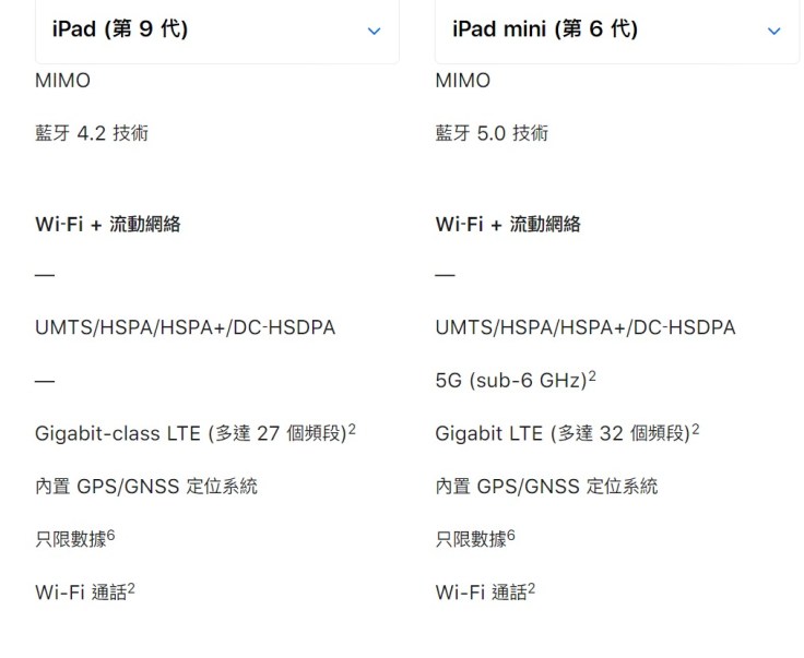 iPad 提供支援流動網絡的 Cellular 版,並非新鮮事,加張 SIM 卡就可以於戶外享受高速上網,不受 WiFi 覆蓋限制,一直備受不少用家厚愛。今年新推出的 iPad Mini 就終於兼容最新 5G NR 網絡,成為最平的 5G iPad,五千幾蚊就可以入手。新 iPad 就繼續支援 4G LTE 網絡,WiFi 規格同樣停留於 WiFi 5 (802.11ac)。