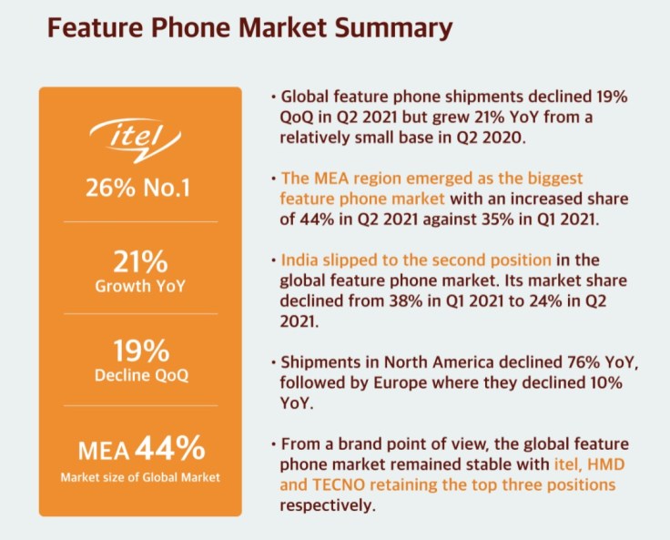 iTel 之所以稱霸全球功能手機市場,主因在於掌握印度、中東非洲 (MEA) 兩大重要市場,這兩個市場的功能手機出貨量分別位列全球第一、第二。今季中東非洲市場成功取代印度成為出貨量最高地區,出貨量份額由35%急升至44%,證明中東、非洲對功能手機需求急增,印度出貨量份額則跌至24%。