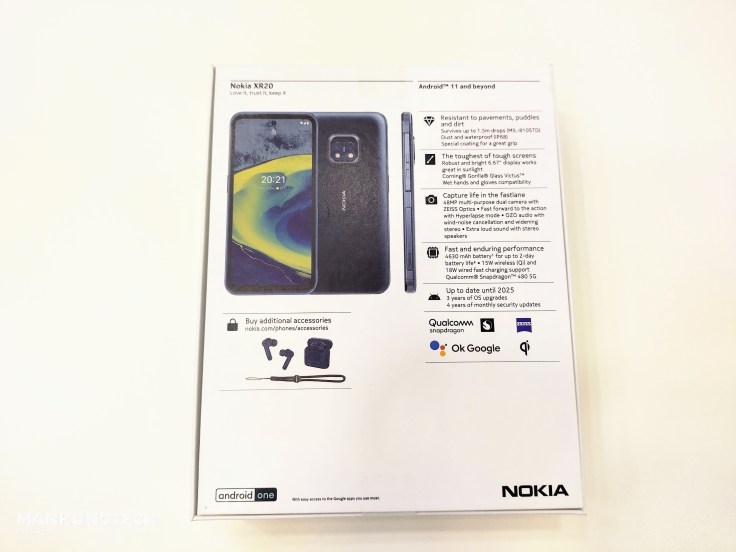 由背面說明可見,Nokia XR20 支援 Qi 無線充電,亦附三年系統升級保證、四年安全升級保證,領先所有 Nokia Android 手機,可說是恆久之選