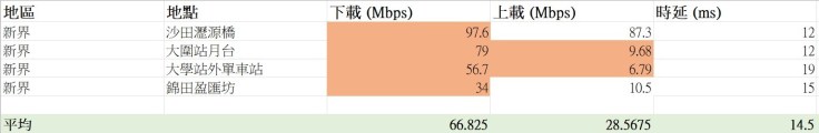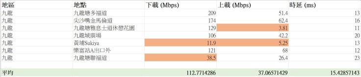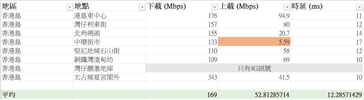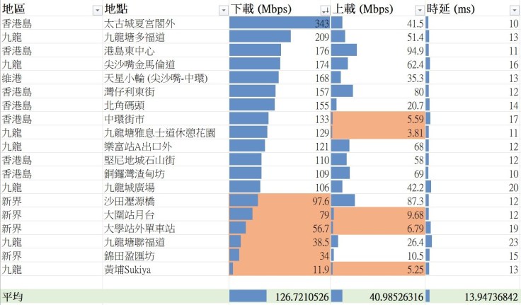 橙色代表表現未如理想,下載低於100Mbps,或上載低於10Mbps