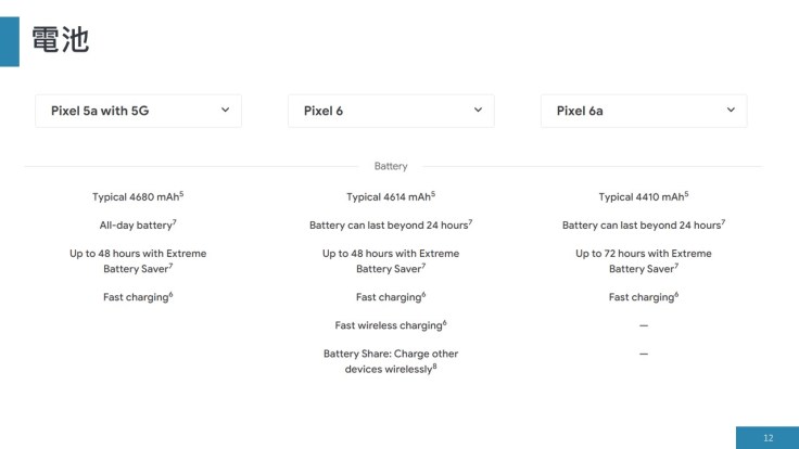至於電量,Pixel 5a 電量最多,擁有4680mAh;Pixel 6a 電量最少,只有4410mAh,相信與機身體積偏小有關。其實兩者相差不足300mAh,對續航力實際影響有限,可以不理