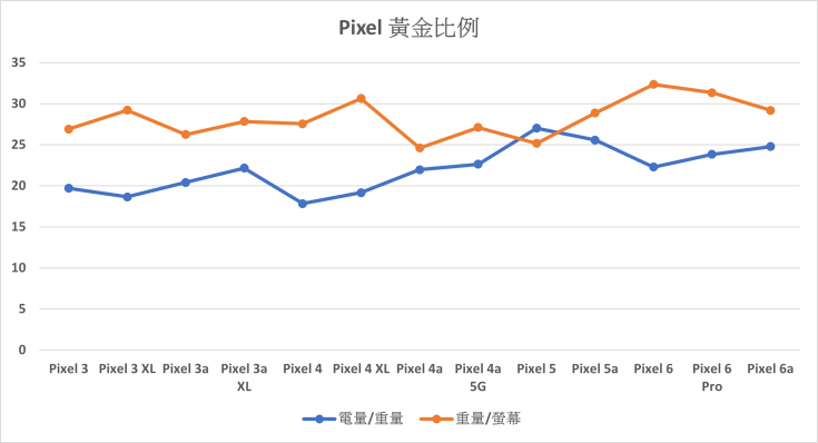 第一種比例電量/重量越高越好,第二種比例重量/螢幕就是越低越好,上述 Pixel 手機之中,只有 Pixel 5 能夠達到兩種比例同時兼顧,做到最佳平衡。