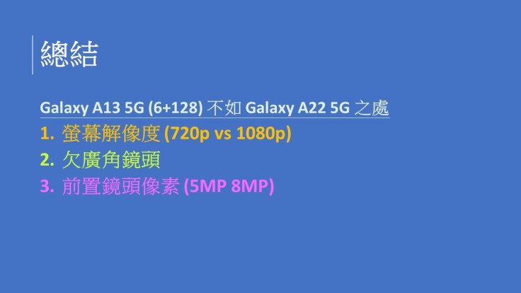上圖已經清楚簡潔地比較兩部電話的相機,大家應留意 Galaxy A13 5G 並不配備廣角鏡頭,前置鏡頭像素數量比 Galaxy A22 5G 少,另外主鏡頭光圈較細。雖然 Galaxy A13 5G 加入 Galaxy A22 5G 沒有的微距鏡頭,但此類鏡頭實用性低,還是不及廣角鏡頭般重要