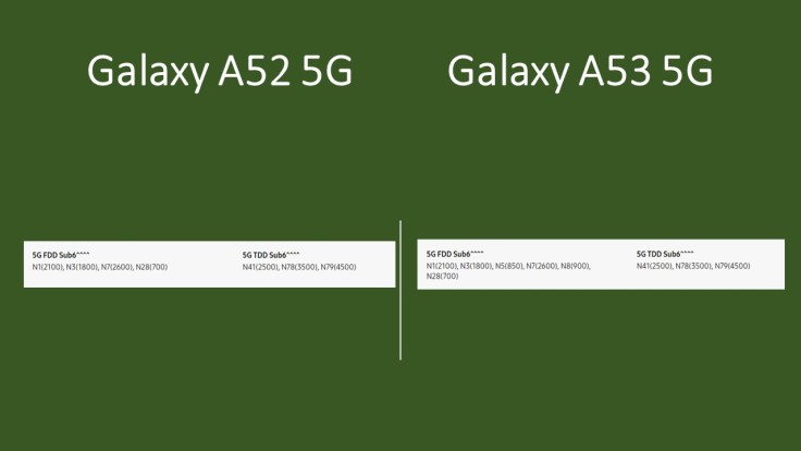 Galaxy A52、Galaxy A53 均支援 5G NR 網絡。後者兼容較多 5G 頻譜,在前代基礎上加入了 N5 與 N8 兩段,有助漫遊接收