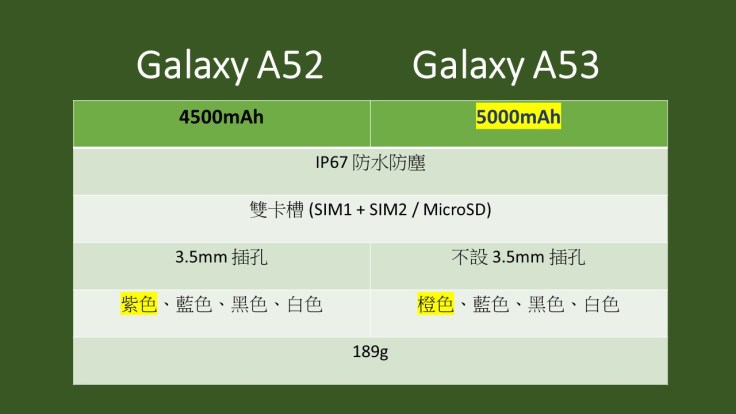 Samsung Galaxy A53 一大進步在於電量,由上一代 4500mAh 增加至 5000mAh,相信可改善續航力。然而 Samsung Galaxy A53 跟隨潮流,不再提供 3.5mm 音訊插孔,可說是缺點,為上一代多加一個購買理由