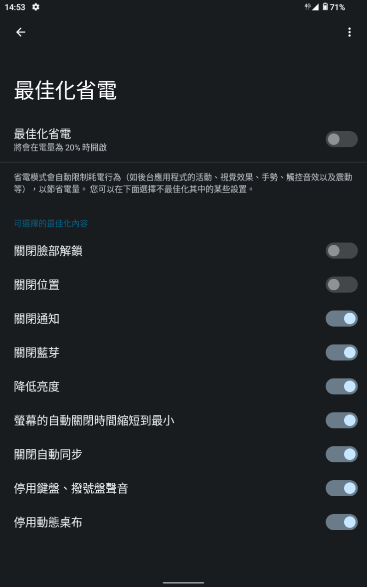 省電模式設定相當詳細,可以自行選擇關閉甚麼功能延長電池壽命。