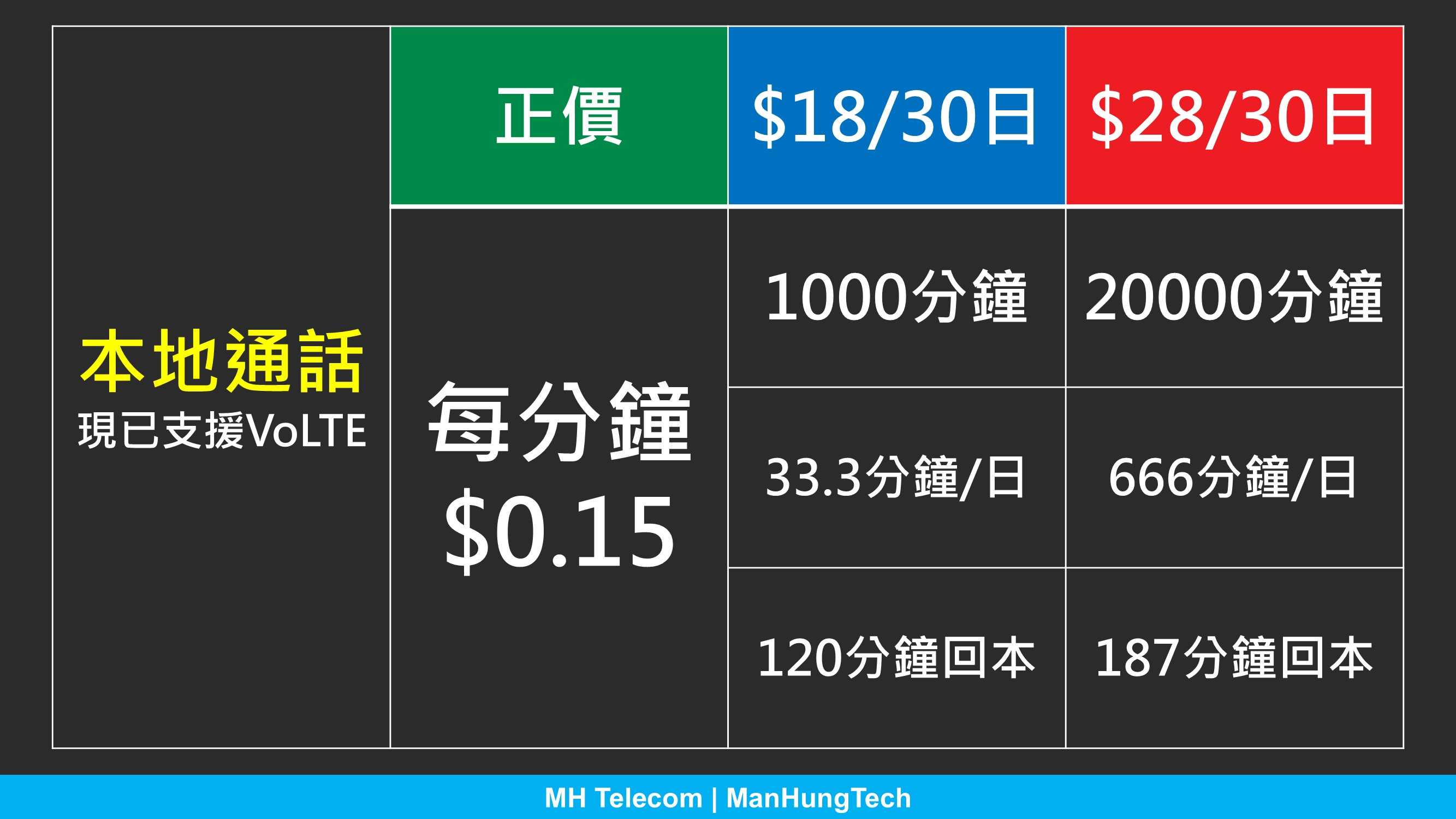 高通話需求人士可考慮本地通話月費組合,設$18/1000分鐘、$28/20000分鐘兩款選擇。大家可根據平日用量,考慮是否需要申請月費組合節省開支,上圖清楚列明各組合回本所需分鐘。