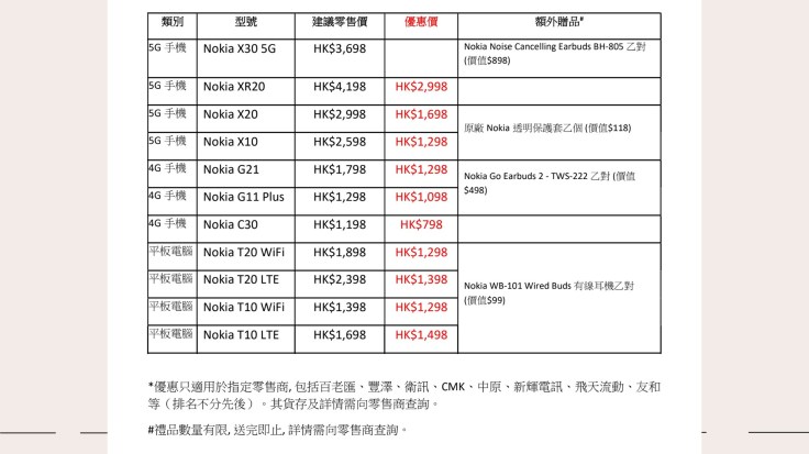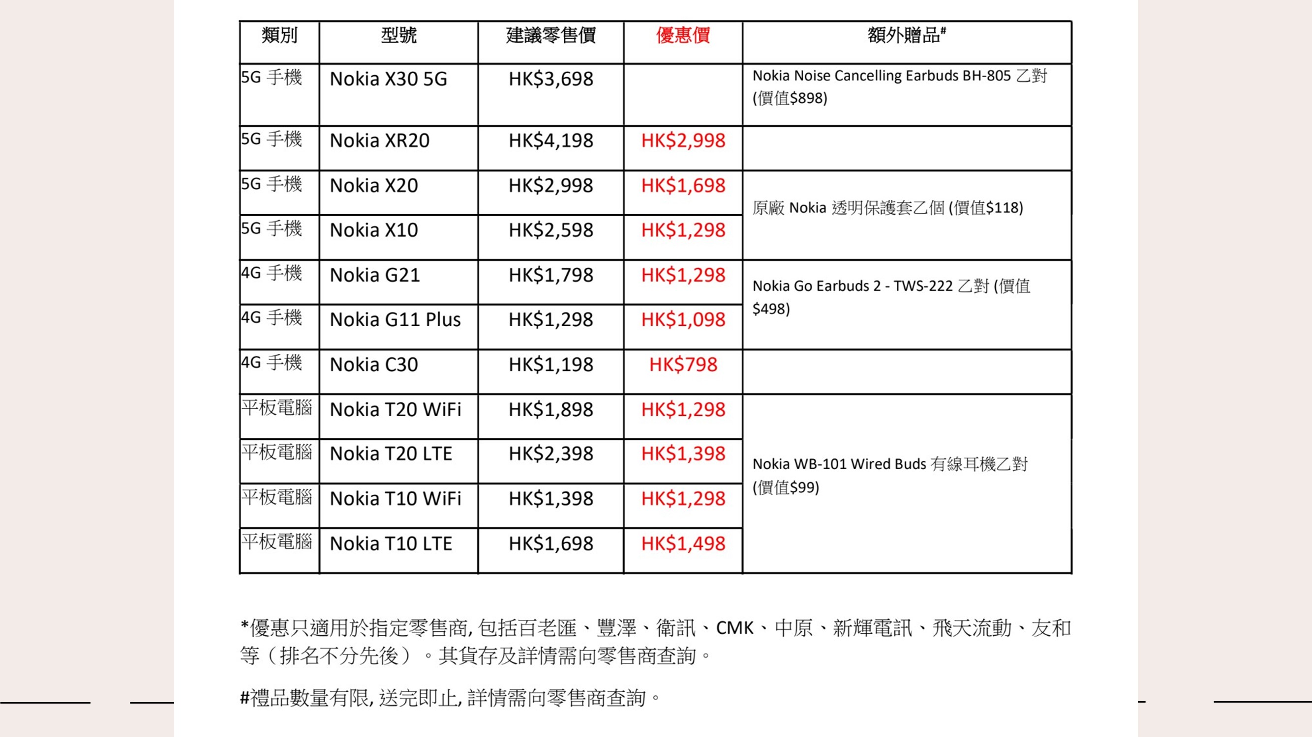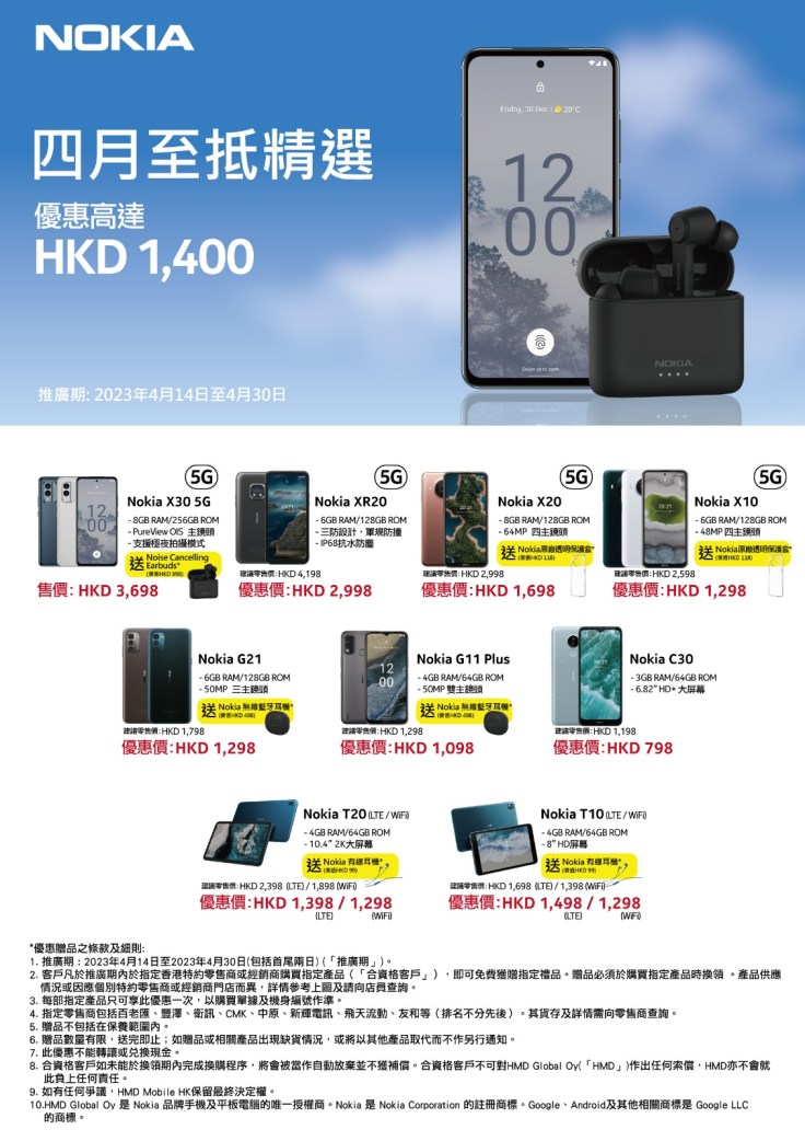 Nokia X30 5G 加送 Nokia Noise Cancelling Earbuds,價值港幣898,此無線藍牙耳機支援 ANC 主動降噪技術。Nokia X20、Nokia X10 雙雙減價至二千元以下,可說是市場上難得一見配備高通處理器的千元 5G 機,另外加送 Nokia 原廠透明膠套。Nokia T20、Nokia T10 兩款平板電腦不單提供優惠,再附贈 Nokia 有線耳機,價值港幣99。