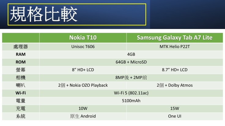 Nokia T10 與 Samsung Galaxy Tab A7 Lite 各有一項特色功能。
