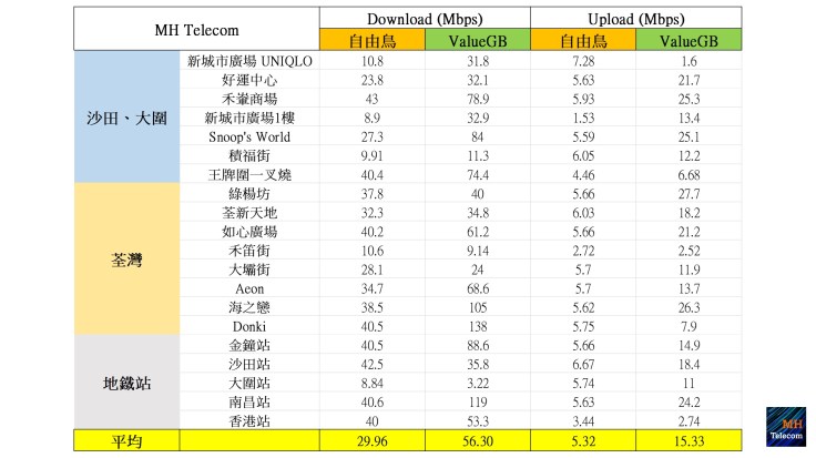 全速對決限速,確實不太公平,其實 Man 希望透過本次測試了解兩者真正水準,例如 ValueGB 全速能夠達到何等速度、與自由鳥的差距程度、多少時間下載速度突破 42Mbps,證明就算使用同一網絡,實際表現仍存在明顯分別。以上測速數據足以憑真實數字解答上述問題,測試地點涵蓋室外、室內環境,以及地鐵站,具有一定參考價值。